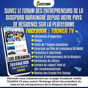 Vous êtes invités à vous abonner à la page Facebook Tounga TV, pour suivre en direct l’échange du Président du Faso avec les entrepreneurs de la diaspora.