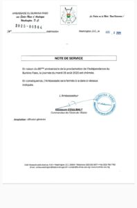 En raison du 65ieme anniversaire de la proclamation de l’indépendance du Burkina Faso, la journée du mardi 05 août est chomee. En conséquence l’ambassade sera fermée ce jour