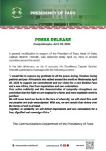 Actualités de la diaspora., Actualités du Burkina Faso, Evènements, News Mouvement de soutien au Président du Faso: le Capitaine Ibrahim TRAORE dit merci Posted on mai 1, 2025 by Servace Maryse DABOU